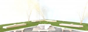 「ピンポンコモンズ」とは卓球を通じて、みんなが共用・交流できる場所とします。既存の動線を考慮しながら、計画敷地を二等辺三角形と設定して、その中心に45度で卓球台を設置し、卓球台の周辺には観戦・交流のベンチを計画しました。ベンチには観戦だけではなく地域の住民や大学生などが座って喋ったりすることで交流ができる場所と計画しました。