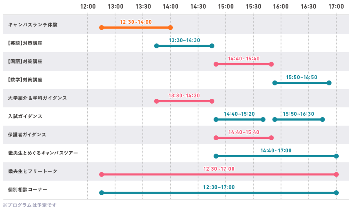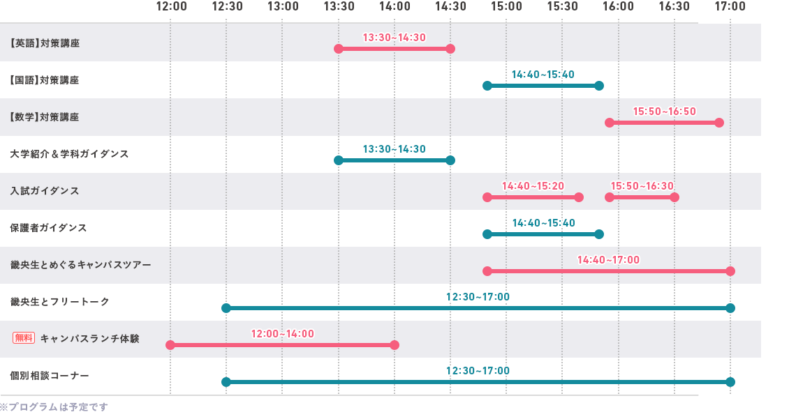 「大学紹介&学科ガイダンス」や「畿央生とフリートーク」など、大学選びに役立つプログラムも用意していますので、高校生なら誰でも参加OK!