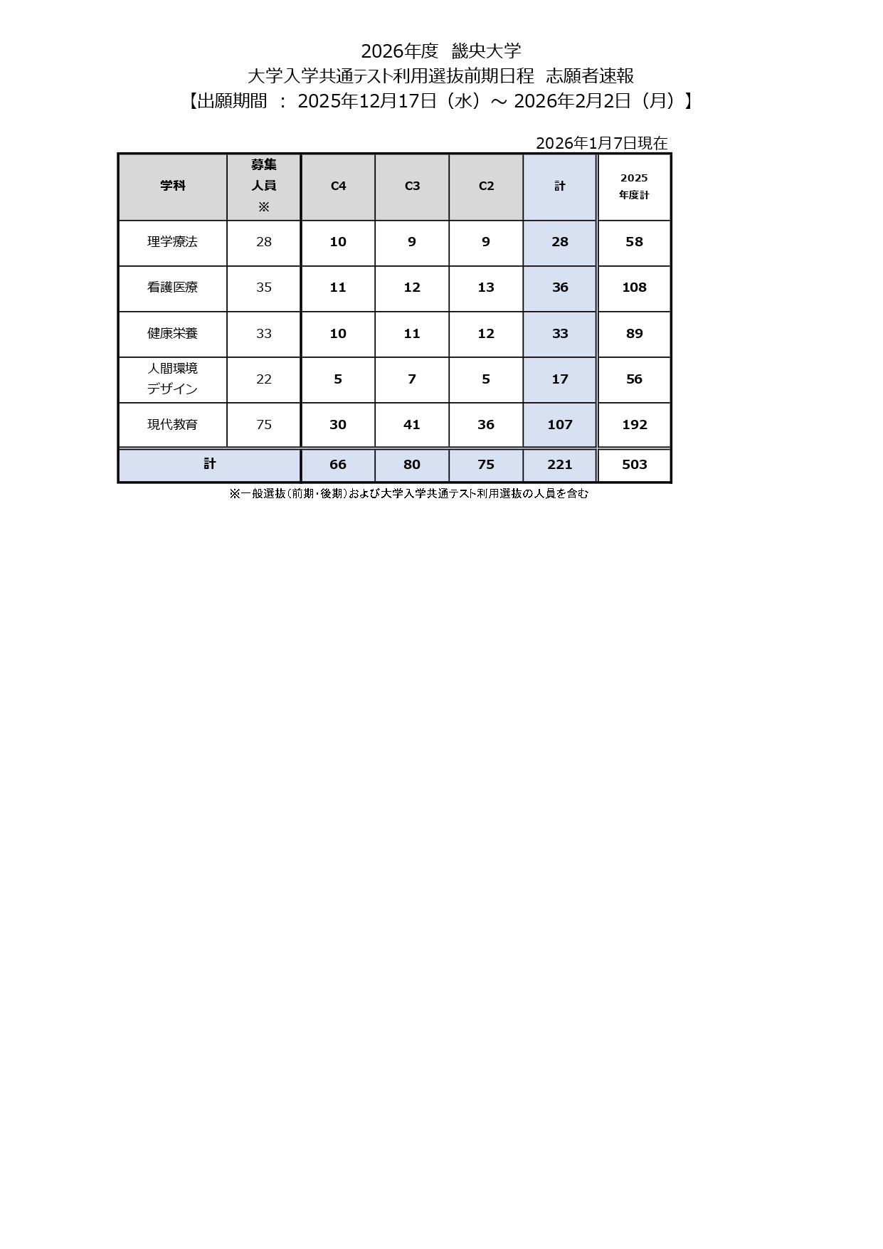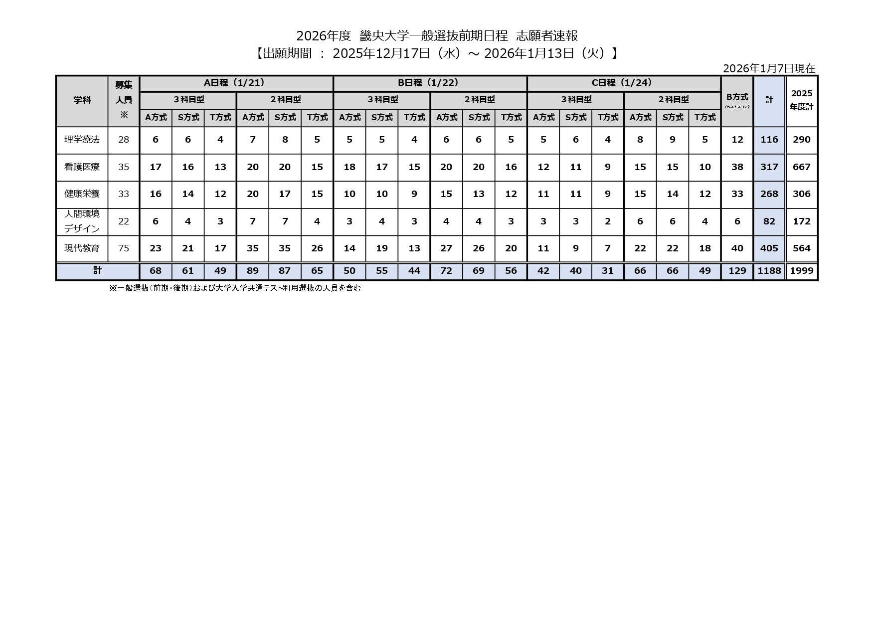 入試情報 トップ 入試情報 志願者速報 志願者速報 2026年度リーダーシップ選抜1次選考志願者【確定】2026年度公募推薦選抜志願者【確定】2026年度一般選抜前期日程(1月7日現在)2026年度大学入学共通テスト利用選抜前期日程(1月7日現在)2026年度一般選抜・大学入学共通テスト利用選抜後期日程 入試情報 入試日程 入試制度 リーダーシップ選抜 公募推薦選抜 一般選抜前期日程 一般選抜後期日程 大学入学共通テスト利用選抜(前期・後期) 社会人選抜 インターネット出願・受験票 合格発表 学費・奨学金 アドミッション・ポリシー 畿央大学が求める学生像 入学者選抜の基本方針 志願者速報 リーダーシップ選抜1次選考【確定】 公募推薦選抜【確定】 一般選抜前期日程(1月7日現在) 大学入学共通テスト利用選抜前期日程(1月7日現在) 入試結果 2026年度入試結果 2025年度入試結果 2024年度入試結果 募集要項 入学手続 Q&A 学校保健安全法で出席の停止が定められている感染症に関する注意事項 大学院・専攻科・別科入試 大学院 助産学専攻科 臨床細胞学別科 入学前教育 KIO NEWS・攻略ガイド 科目等履修生