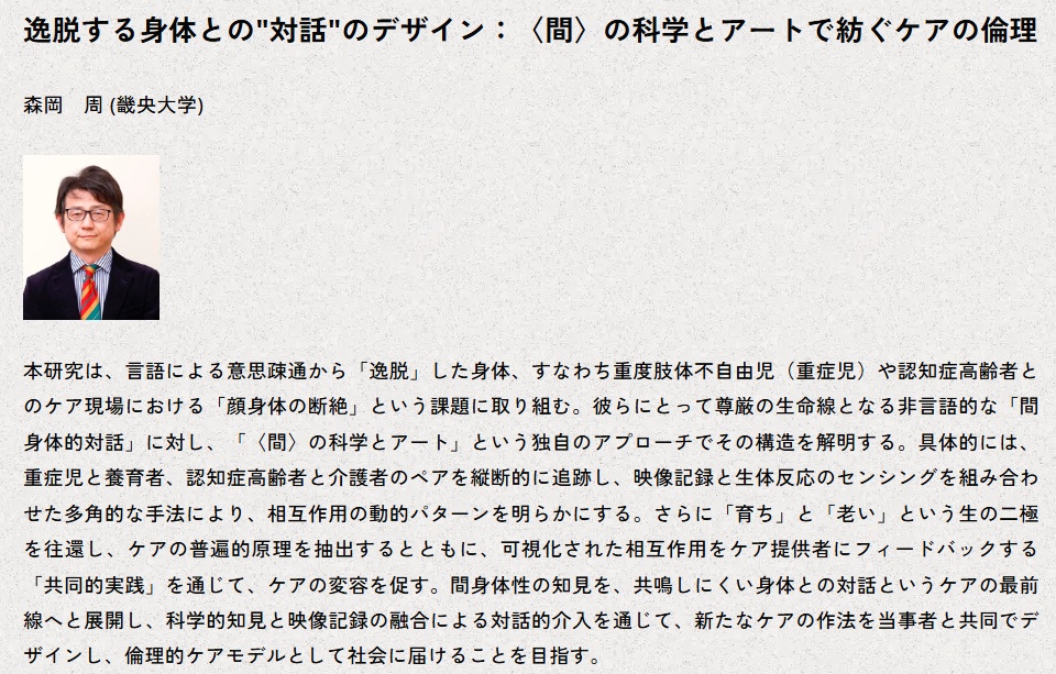 畿央大学ニューロリハビリテーション研究センターの森岡 周教授が、学術変革領域研究(A)「顔身体のデザイン:実践・実証・設計に基づく顔身体の深化と昇華」において、公募研究班として採択されました。重度肢体不自由児や認知症高齢者とのケアの場における、言葉だけでは捉えきれないやりとりに着目し、科学とアートの両面から新たなケアの方法論を探る研究です。