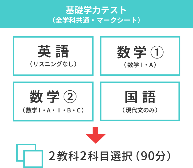 基礎学力テストは「英語」「数学①」「数学②」「国語」から、試験当日に2教科2科目を選択するマークシート方式。教科書レベルで基礎学力を問う問題なので、受験対策をしやすいことが特徴です。90分間休憩がないので、時間配分に注意しましょう!