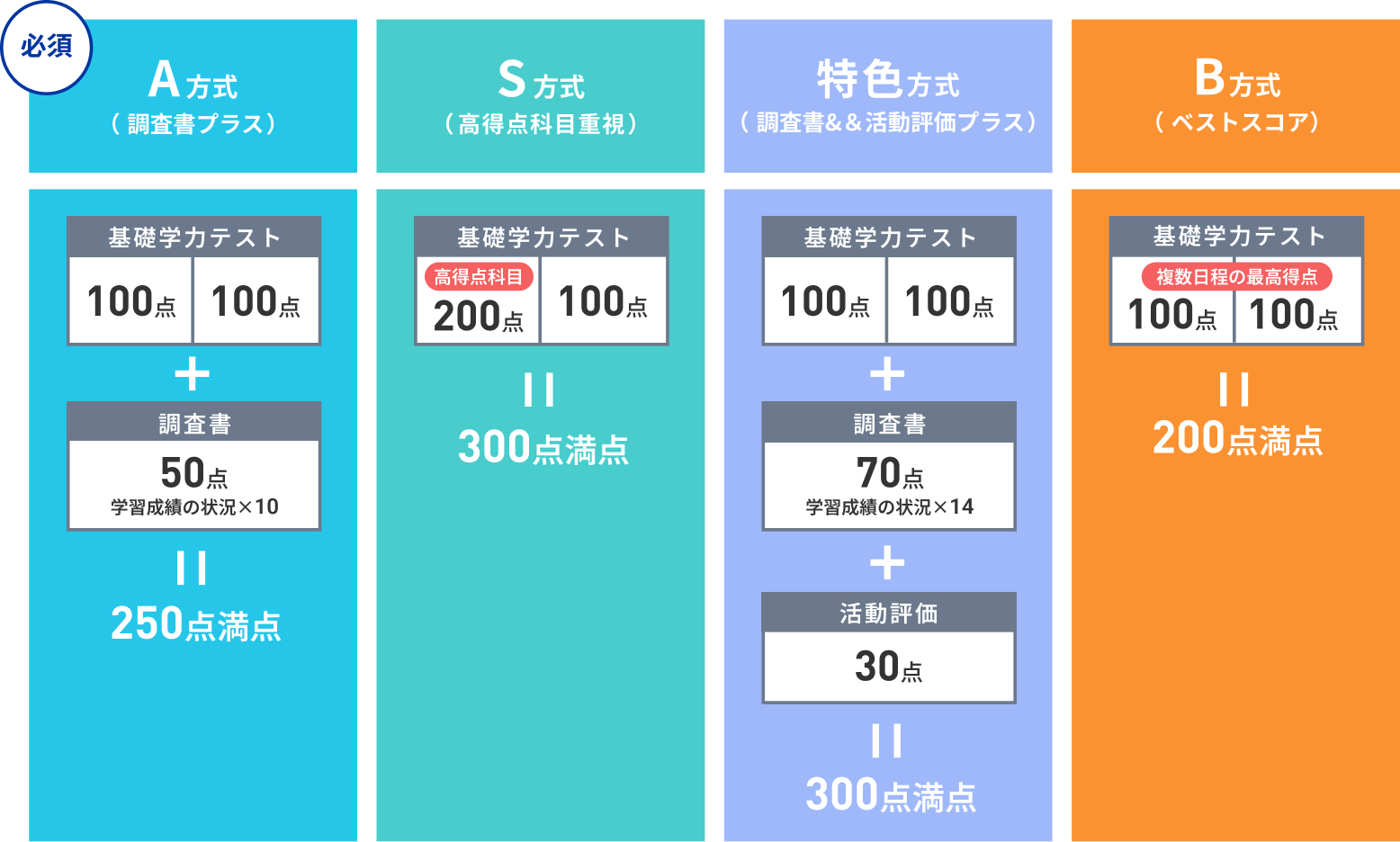 判定方式は3種類。必須のA方式に加えて、S方式や特色方式を追加可能です。複数日程を出願すると、B(ベストスコア)方式※も無料で追加可能です。※出願条件あり