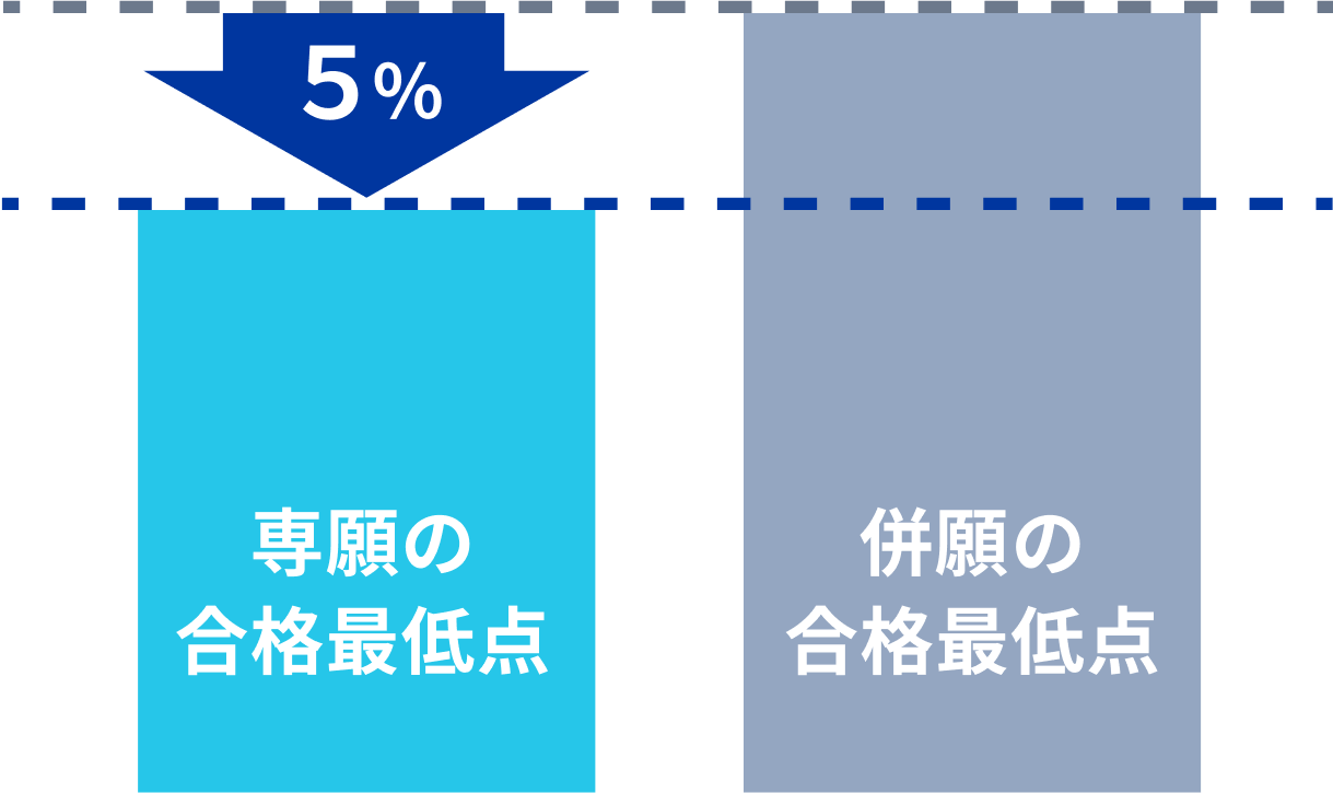 出願時に専願を選択すると、合否判定時に合格最低点を5%優遇します(志望学科①のみ)。ただし、合格した場合には必ず入学することが条件です。