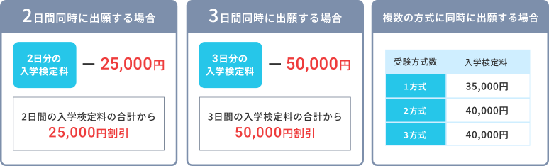 A・B・C日程のうち複数の日程に同時に出願すると、入学検定料の割引(最大3日間で50,000円)があります。また複数の方式に同時に出願する場合、2方式目追加はプラス5,000円で出願でき、2方式以上の入学検定料は同額です。
