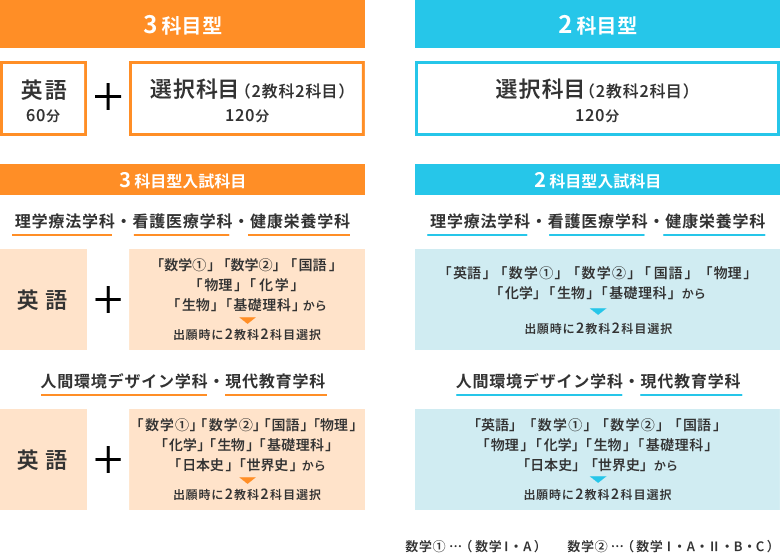 英語と選択科目から2科目を選択する「3科目型」と、選択科目から自由に2科目を選択する「2科目型」のどちらかを選ぶことができます。選択科目(2科目)は120分間休憩がないので、時間配分に工夫が必要です。