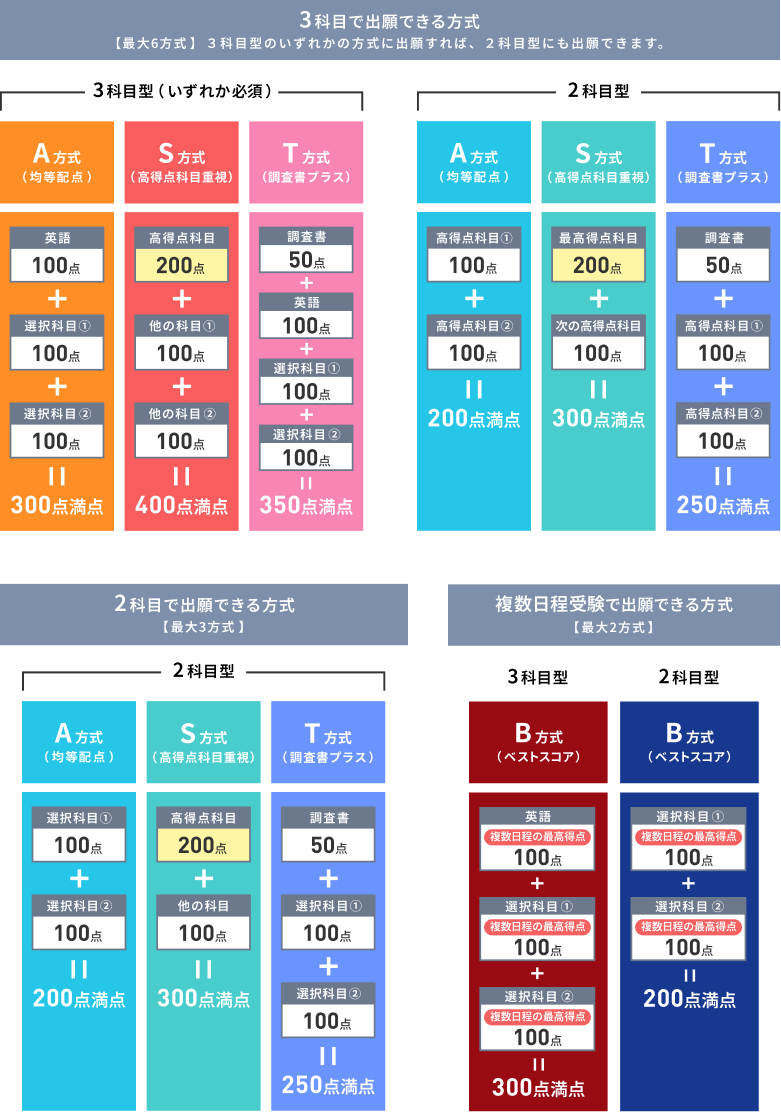 3科目型、2科目型ともに当日の試験をすべて均等配点する「A方式」、高得点科目を2倍にする「S方式」、調査書(学習成績の状況×10)を加点し高校の成績をいかすことが可能な「T方式」があります。3科目型で受験する場合は2科目型の方式にも同時に出願可能で、1日の試験で最大6回の判定を受けられます。試験は3日間あるため、最大で18回合格のチャンスがあります。複数日程に出願すると、さらに3科目型B方式※や2科目型B方式※にも無料で追加可能です。