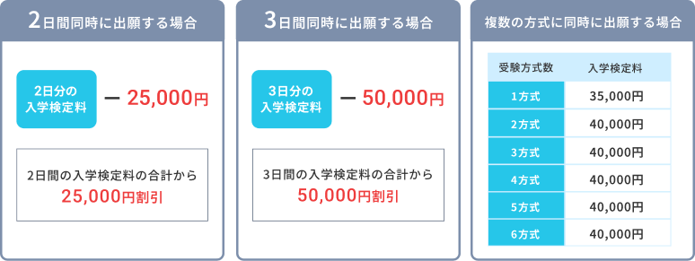 A・B・C日程のうち複数の日程に同時に出願すると、入学検定料の割引(最大3日間で50,000円)があります。また複数の方式に同時に出願する場合、2方式目追加はプラス5,000円で出願でき、2方式上の受験は同額(40,000円)です。なお、公募推薦選抜を受験されている場合は入学検定料の合計(上記割引後)からさらに25,000円割引します。