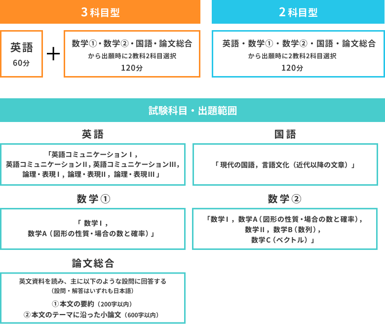 英語と数学・国語・論文総合から2科目を選択する「3科目型」と、自由に2科目を選択する「2科目型」のどちらかを選ぶことができます。3科目型も2科目型も選択科目は120分休憩がないので、時間配分に工夫が必要です。