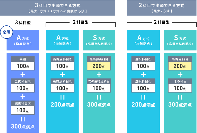 3科目型、2科目型ともに当日の試験をすべて均等配点する「A方式」、高得点科目を2倍にする2科目型「S方式」があります。3科目型で受験する場合は2科目型にも同時に出願可能で、1日の試験で最大3回合格のチャンスがあります。