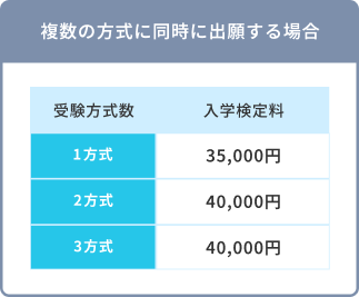 複数の方式に同時に出願する場合、2方式目追加はプラス5,000円で出願でき、2方式以上の受験は同額(40,000円)です。また、公募推薦選抜や一般選抜前期日程を受験されている場合は入学検定料からさらに25,000円割引します。