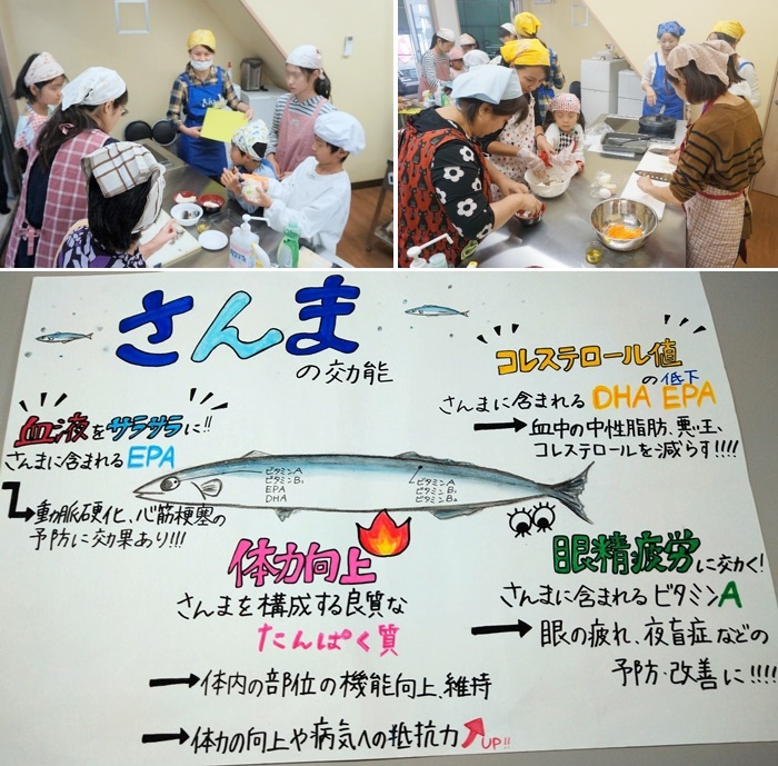 電熱調理器を使う作業や包丁を使う作業などは大人の参加者が行い、他の簡単な作業などは子どもが行うなど、各班協力しながら楽しそうに調理を行っていました。調理中は「僕もみじん切りをしてみたい」や「さんまバーグをこねたい」など参加者の子どもたちから元気のいい声が飛び交っていました。スタッフの学生達は終始参加者とコミュニケーションをとり、説明も交えながらいい雰囲気づくりを心掛けていました。参加者からは「今日のような調理方法でさんまを食べたのは初めてです」「短い時間の中で誰でもできるように学生さんがサポートしてくださいました」との声をいただきました。