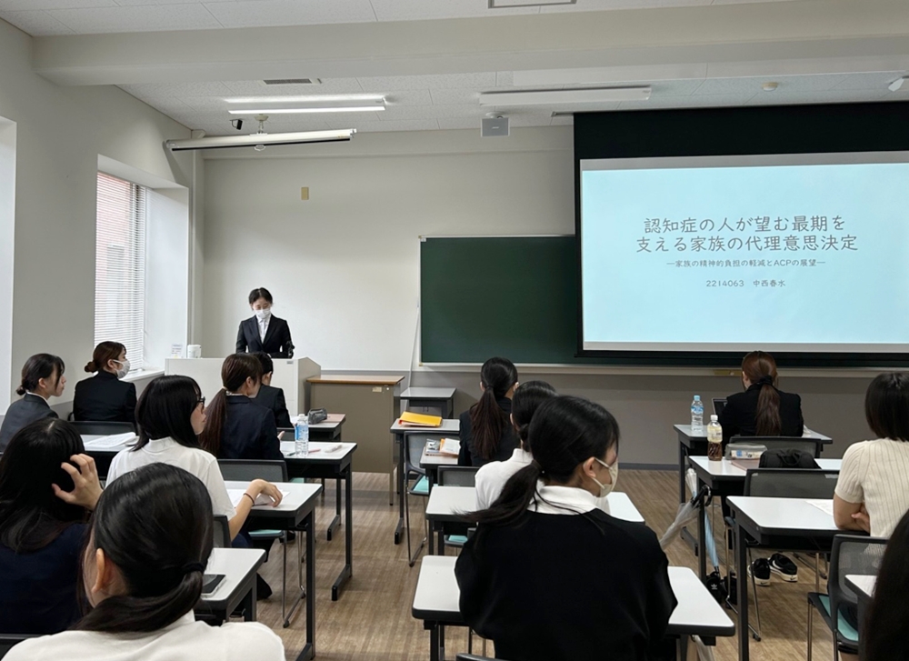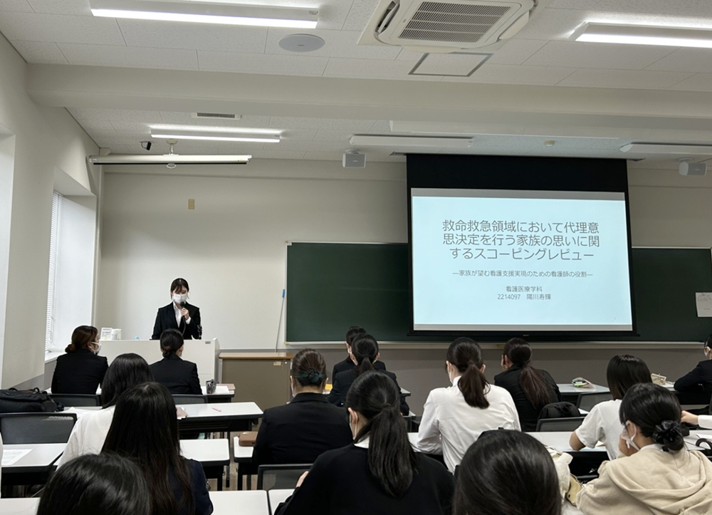 自分の論文を発表するときはとても緊張しました。しかし、論文を完成させ、多くの人の前で発表することは大きな達成感と自信に繋がりました。また、発表会は知識を深める貴重な機会であり、他の学生の研究を聞くことで、自身の専門分野外の知見や新たな視点を学ぶことができました。また質疑応答では、自分では気づけなかった多角的な視点に気づくことができ、研究への理解を一層深めることができました。今後は、この経験で培った学びへの意欲と探究心を活かし、患者さん一人ひとりの状況やニーズを深く理解し、根拠に基づいた、より質の高い看護を提供できるよう尽力していきたいと思います。