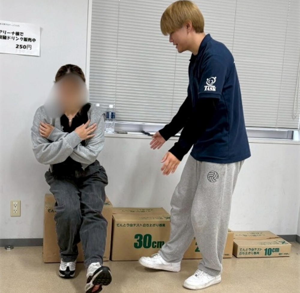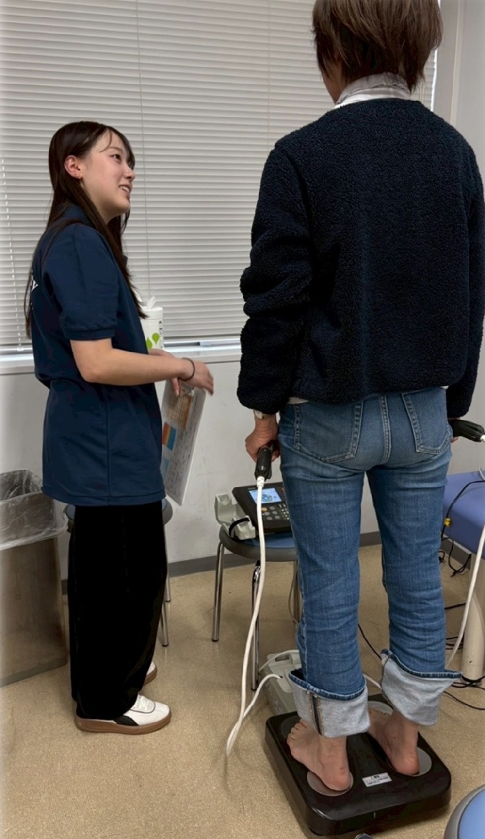 今回私は立ち上がりテストを担当しました。年齢や性別を問わず多くの方にご来場いただき、それぞれの方に合わせた説明やコミュニケーションを取る大切さや難しさを実感することが出来ました。最初は自分にちゃんと測定ができるのかという不安と緊張がありました。でも来てくださった方と話したりしているうちに緊張が解けて、自然に笑顔で話せるようになっていました。
