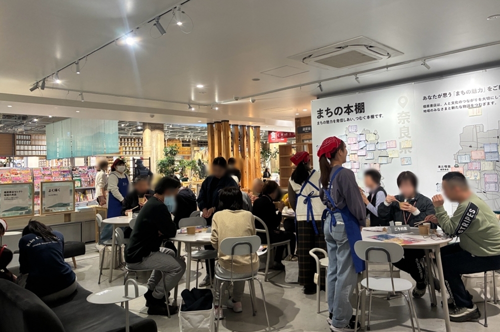 恒例のもぐもぐタイムは本と喫茶で、無印良品で販売されている「すぐ使える緑の野菜」と「素材を生かしただしパック 飛魚とかつお」を使ってレシピ開発した「体温まる豆乳みそスープ」を、健康栄養学科の野原講師と学生3名がサーブしました。このスープは、本学ヘルスチーム菜良の学生(管理栄養士のタマゴ)が、開発したものです!