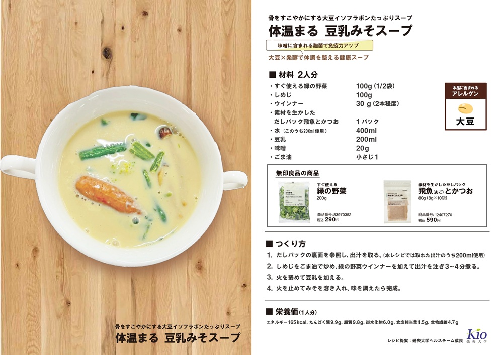 今回のポイントは、骨をすこやかにする大豆イソフラボンを含む大豆製品と、免疫力アップに役立つ発酵食品であるみそを使用し、簡単でありながら味わい深く、体が温まるスープに仕上がりました!