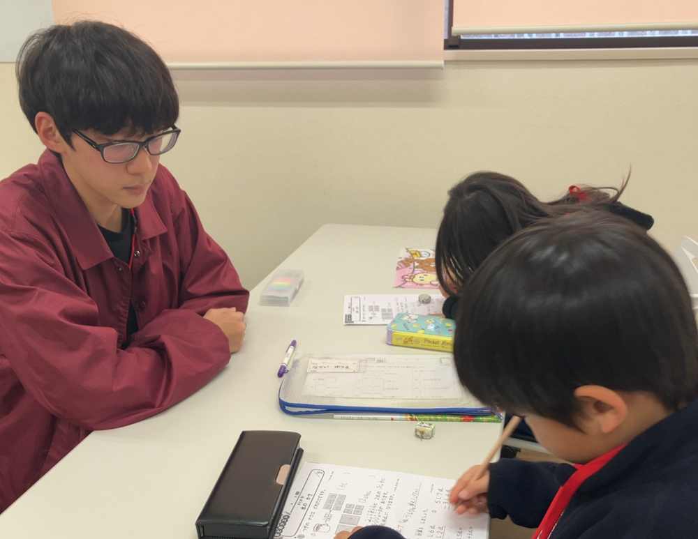 今回は、現代教育学科から3名、看護医療学科から2名の合計5名の畿央学生が参加してくれました。学習の時間は、いつも通り店舗の2階で小学生の持参した宿題のお手伝いをしました。