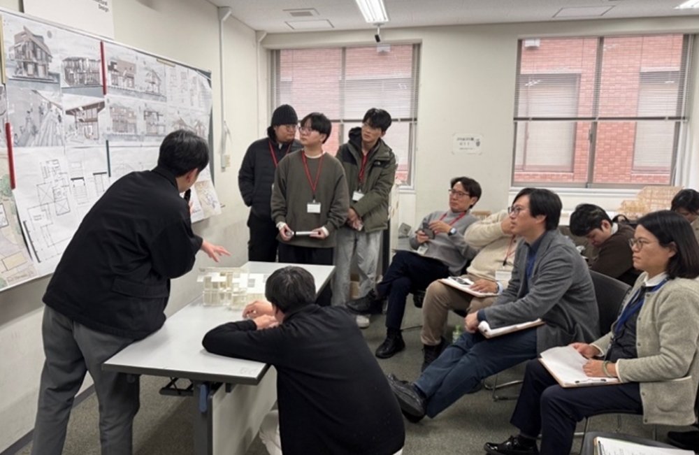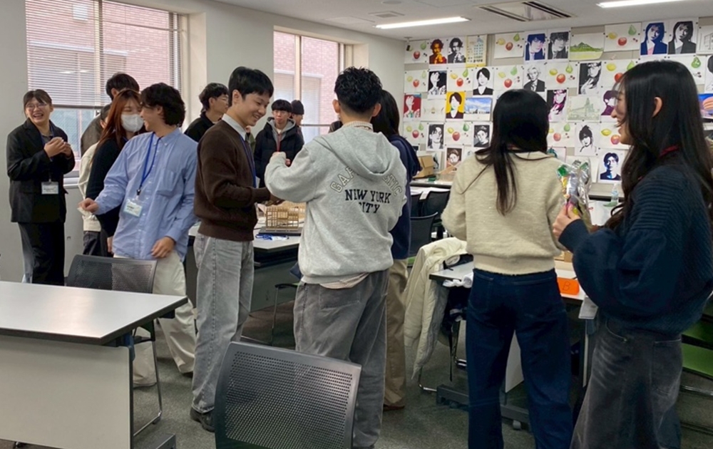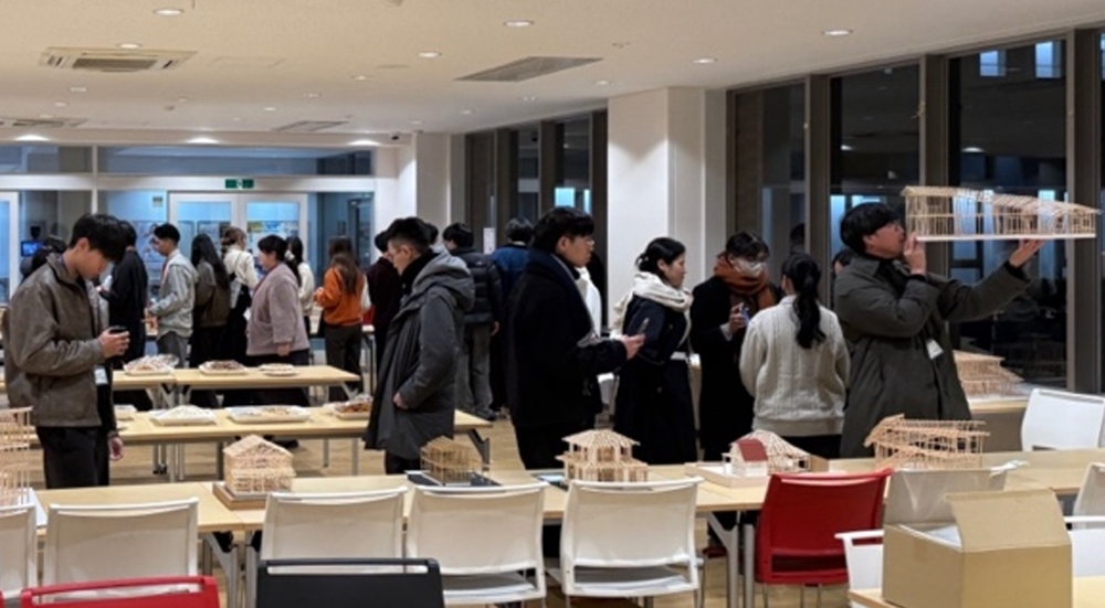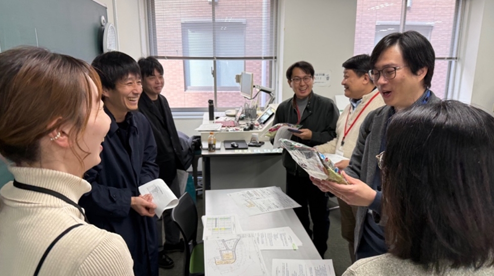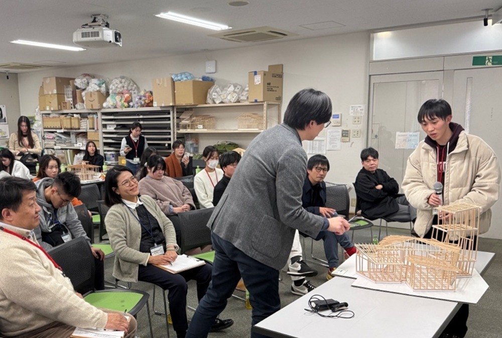 2026年1月29日(木)には、台湾から高雄大学および台湾科技大学の学生17名・教員4名が来学し、人間環境デザイン学科の学生20名・教員6名とあわせて総勢47名が参加しました。午前には、参加者全員の自己紹介とアイスブレイクが行われ、学生同士の会話が始まりました。なお、各班の学生は提案模型を囲み、設計を通じた交流が展開されました。