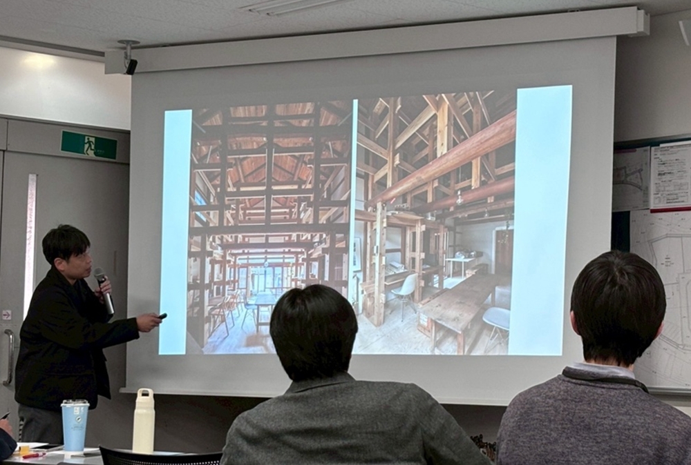 講評会後には、台湾科技大学 蔡先生および本学科の吉永先生によるレクチャーにより、台湾と日本における近年の木造建築設計の事例紹介も行われました。学生たちは翌日に実施される奈良県内の古民家見学のため、本学科の前川先生から日本の木造民家の構造変遷についてのレクチャーも行われ、学生たちは具体的な事例を通じて、学びを深めました。