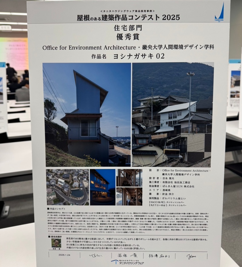 タニタハウジングウェア主催 ”屋根のある建築作品コンテスト2025” において、人間環境デザイン学科 吉永 規夫講師が応募した作品「ヨシナガサキ02」が 「住宅部門 優秀賞」を受賞しました。