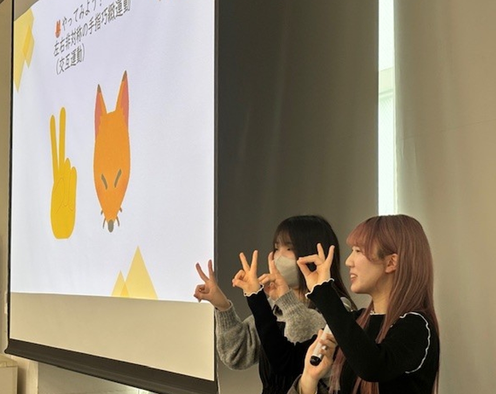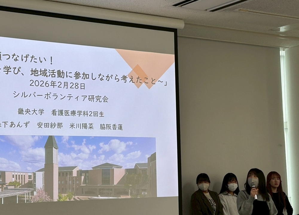 このたび、2026年2月28日(土)に宝塚大学で開催された「シルバーボランティア研究会」にて、活動の核となってきた看護医療学科2年生の4名(森下 あんずさん、米川 陽菜さん、安田 紗那さん、脇阪 香蓮さん)が、その成果を堂々と発表してくれました。