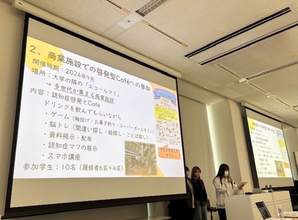 発表では、1年次の講義「認知症ケア論」での学びをきっかけにボランティアに踏み出した経緯から、エコール・マミでの多世代啓発型認知症カフェの企画、近隣自治体でのキッズサポーター養成講座の開催など、多岐にわたる活動を報告。