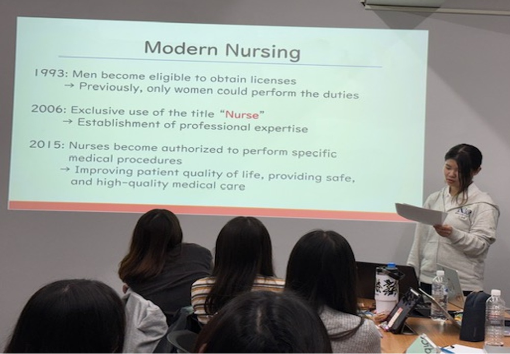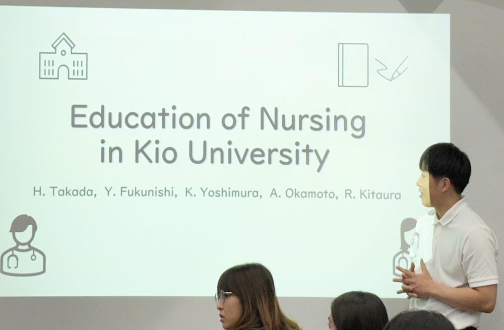 次に4グループに分かれて、各々日本の文化、看護、看護教育等について発表しました。私たちの発表は、日本の文化をテーマに発表し、最後に台湾の学生と一緒に食事の挨拶をしました。緊張しましたが、全員が積極的に参加していただき、とても発表しやすい環境でした。台湾では、教員と学生の距離が近く、意見交換が活発に行われていたことから、学生が主体的に学ぼうとする姿勢につながっていると考えました。