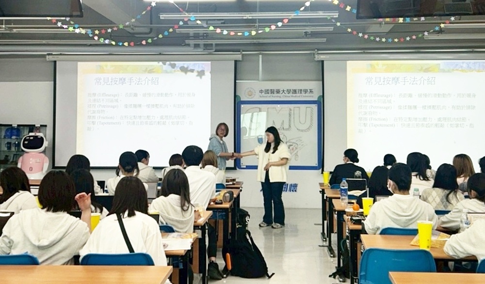 午後からは終末期におけるアロマセラピーの講義・デモンストレーションを行い、マッサージの方法を学びました。その際、台湾の先生や学生が「気持ちいい」と日本語を話をしていて親近感を覚えたのがとても印象的でした。