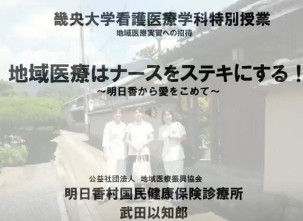 本ブログでは、先日本学にて実施した特別講義「地域医療はナースをステキにする!―明日香から愛をこめて―」の様子をご紹介いたします。講師には、明日香村国民健康保険診療所の 武田 以知郎 先生をお迎えしました。