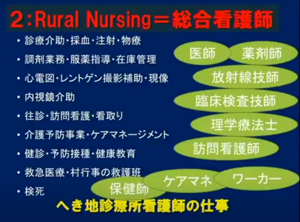 今回の講義を聞いて、少子高齢化や都会への人の流出が増える中で、課題となっているへき地で医療を提供するために総合診療専門医や総合看護師が必要であると学びました。これまでの学習では病棟での医療や看護しか考えたことがなかったのですが、地域での医療においてなくてはならない重要な役割を担っているとわかりました。高齢化が進むこれからの医療に必要不可欠な存在であると思いました。