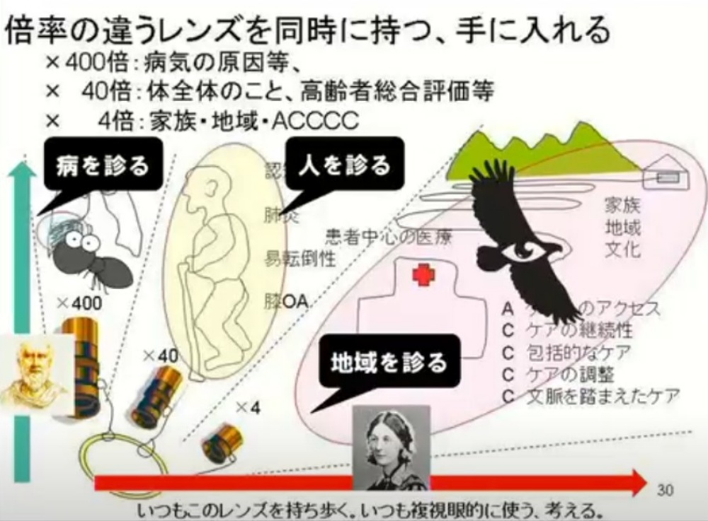 武田先生のご講演を聞いて、長期にわたってへき地に住み続けられている地域住民の暮らしや物語に寄り添う関わりが看護師には求められると学びました。特に、講義の中で話されていた、400倍で病を診る、40倍で人を診る、4倍で地域を診るという3つのレンズを同時に持ち、疾患だけでなく身体全体や生活をみることを今回の実習で心がけていきたいと思いました。実際にへき地という場所に行き、地域住民の生活と健康を捉えながら、自身の看護観を深めていきたいと思います。