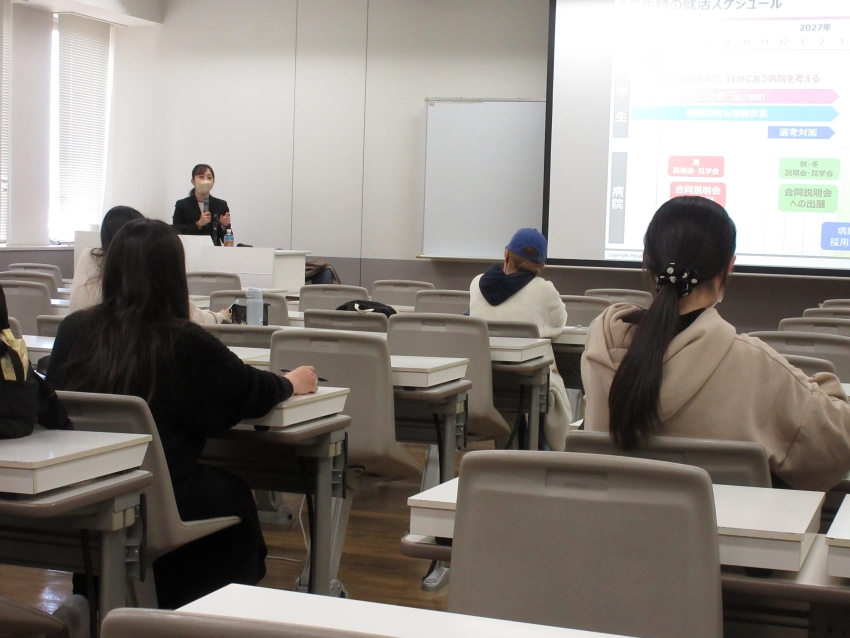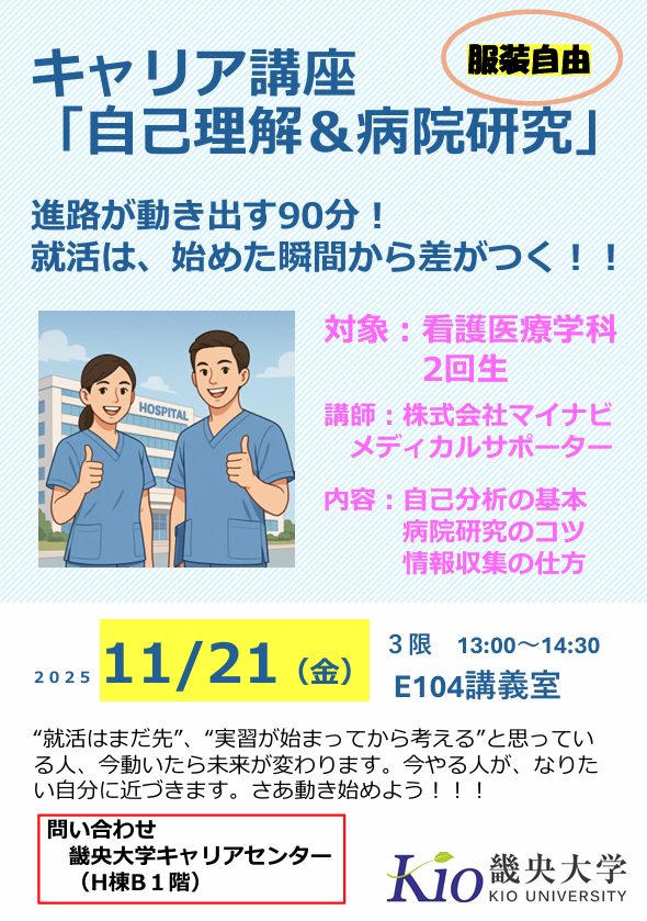 2025年11月21日(金)、看護医療学科2回生を対象としたキャリア講座「自己理解と病院研究」を実施しました。今回の講座では、株式会社マイナビ メディカルサポーター小泉様を講師としてお招きし、就職活動のスタートラインに立つ2回生が「自分らしいキャリア」を描くための第一歩となるよう企画したものです。