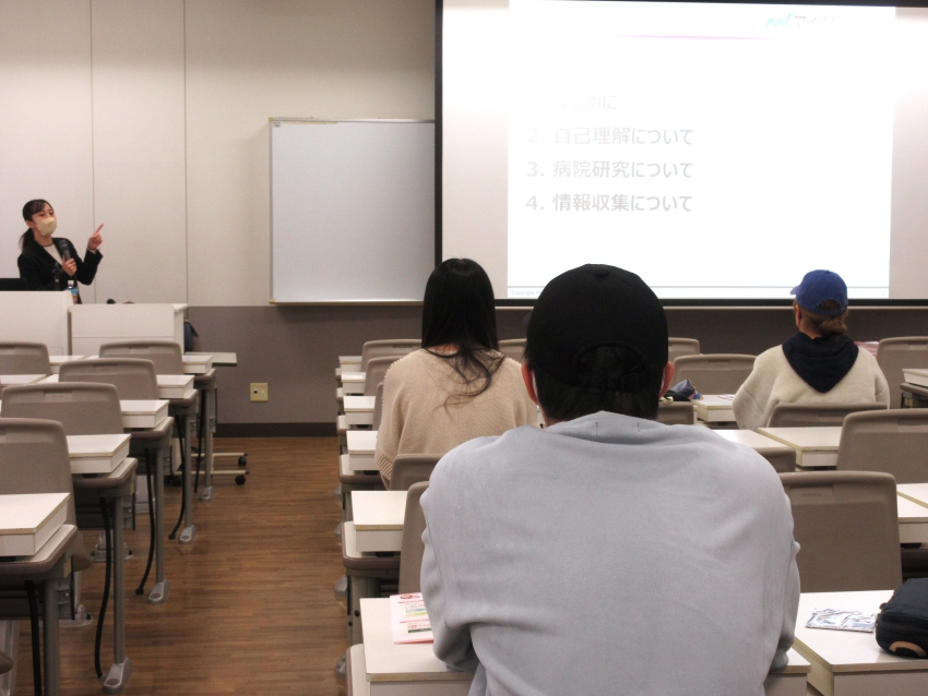 また、病院選びは「理想のすべてが叶う場所」を探すのではなく、優先順位を整理しながら、自分の看護観に合った病院を見つけることが重要とのお話もありました。病院の種類(大学病院・民間病院・公立病院・訪問看護ステーションなど)や医療機能、看護方式、教育体制などについて整理し、各病院の特徴や働き方の違いを学びました。