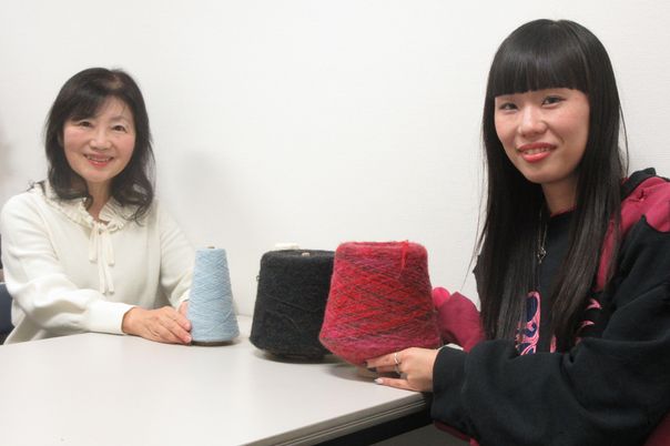 靴下の残糸を手に、指導教授の村田浩子先生と