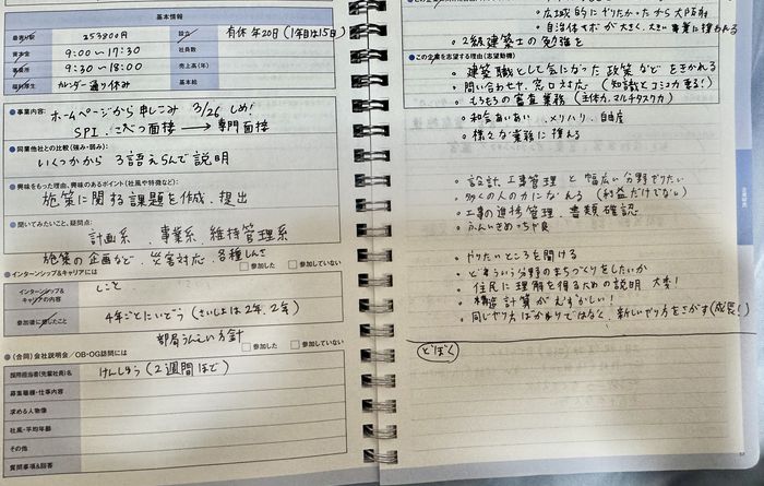 3回生前期のキャリアガイダンスでもらえるマイナビの就活メモ帳が非常に役に立ちました。企業説明会の内容をメモすることはもちろん、面接練習の振り返りや話すネタのメモなど、就活では想像以上にメモを取ることが多くあります。メモを書く欄がすでに作られているため、素早くメモを取らないといけない場面で大活躍します。また、面接前のチェック項目なども書かれているためぜひ確認してみてください。