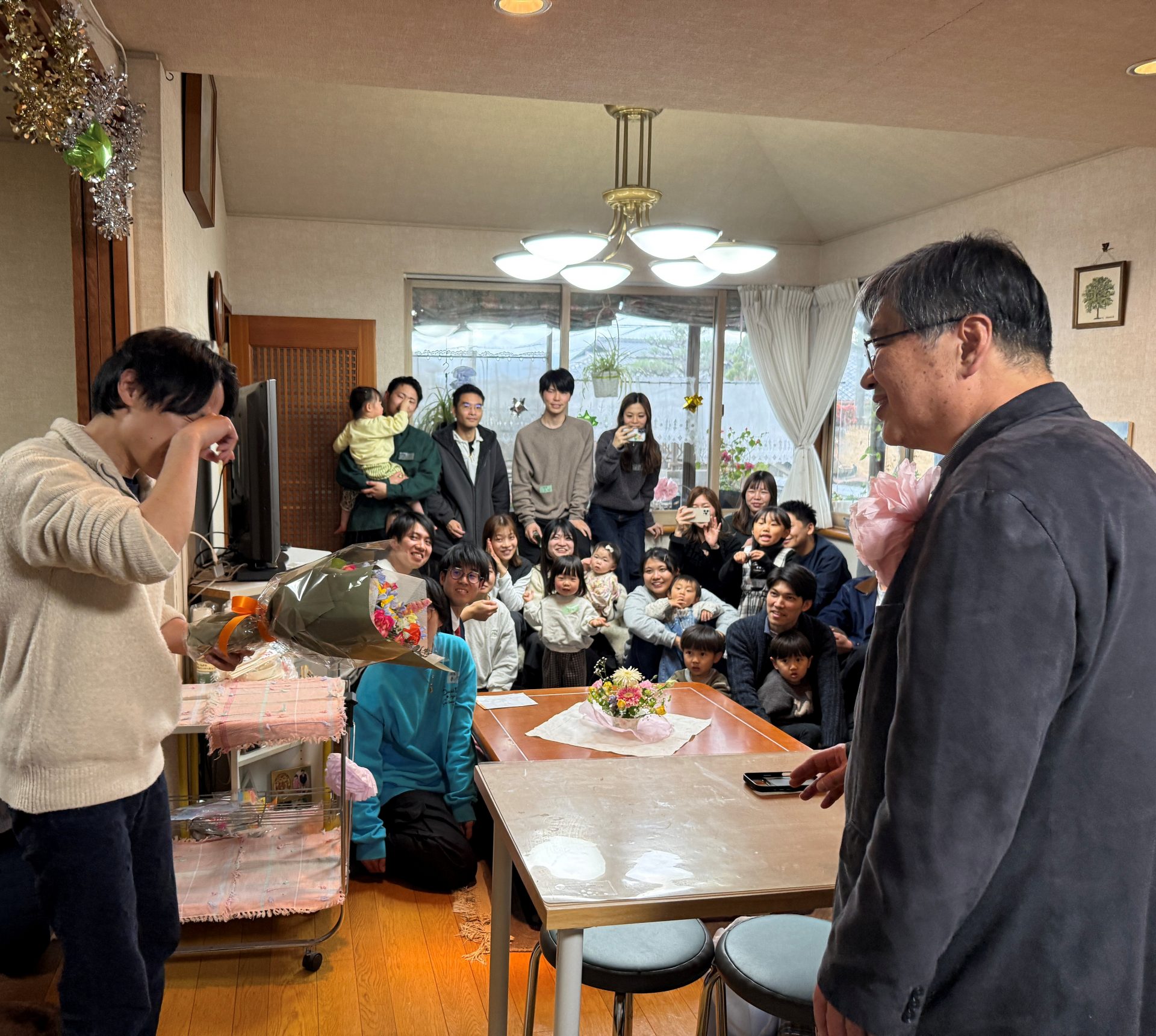 今年度末で教育学部現代教育学科の奥田教授がご退官されるため、令和8年2月28日(土)に元ゼミ生OB・OGの4世代(計24名)が集まって「奥田先生おつかれさまでした会」を開催しました。子育て中の卒業生も多いことを考慮し、奥田先生のご厚意でご自宅を会場としてお借りし、アットホームな雰囲気の中での開催となりました。