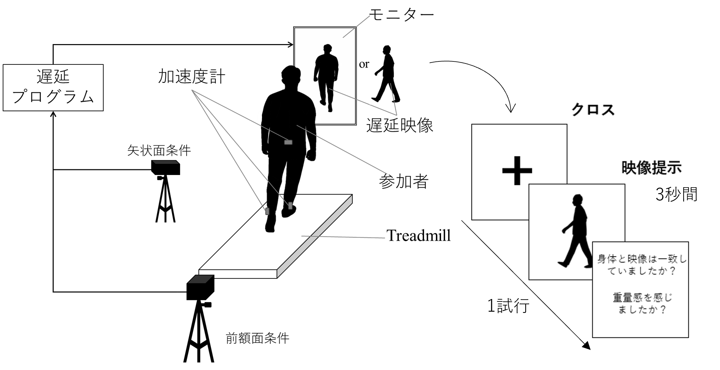 参加者は,トレッドミル歩行中の姿をカメラで撮影され,リアルタイムに前方のモニターに映し出された.このフィードバックには遅延が設けられ,その遅延に気づいたかどうかの判断が求められた.遅延判断と同時に身体重量感も聴取された.歩行パラメータは加速度計にて計測された.