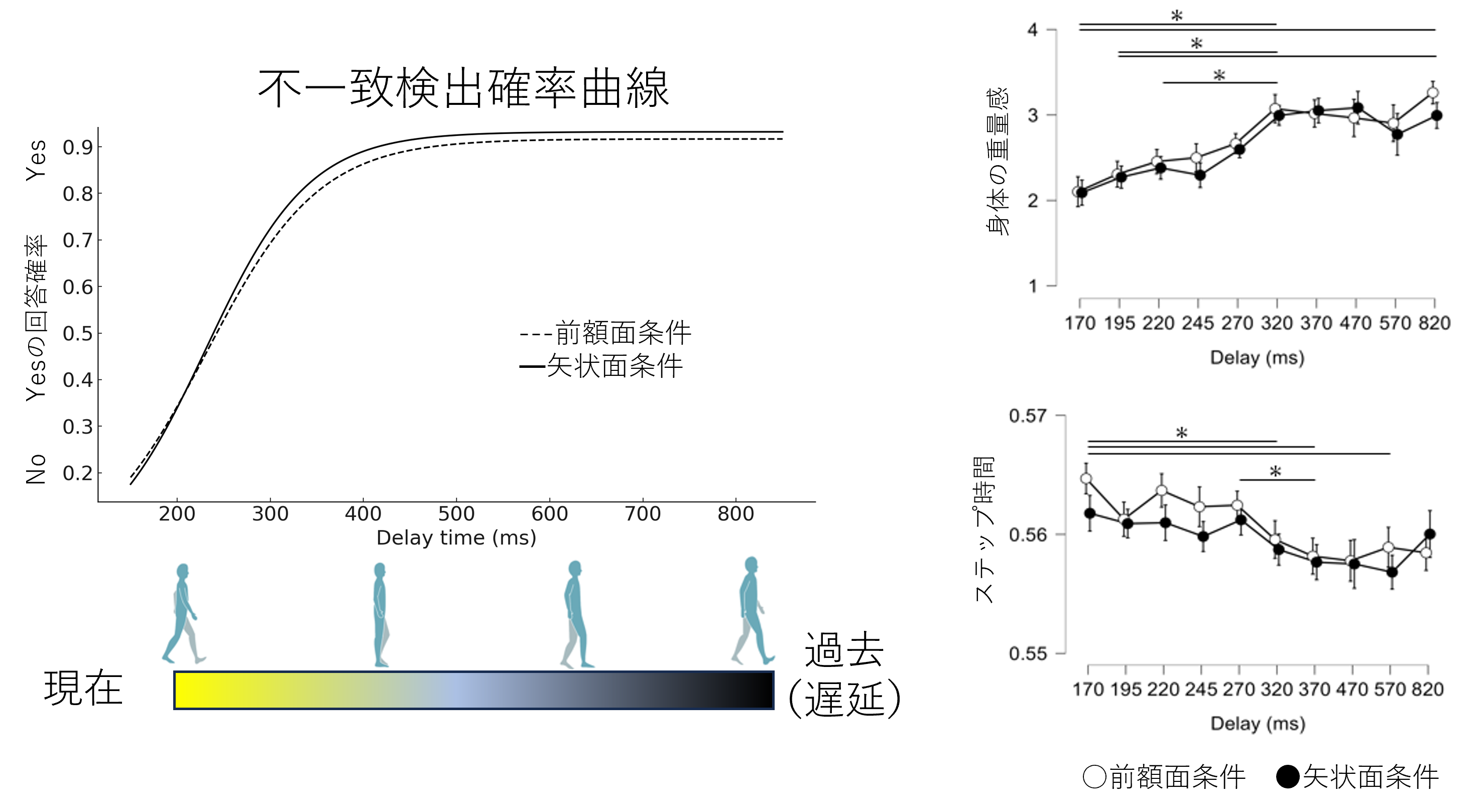 左:不一致(遅延)検出確率曲線を表す.遅延時間の増加に伴い,遅延判断(Yes)の回答確率が上昇していることがわかる.右上:遅延時間増加に伴う身体重量感の変化を表す(7段階評価).右下:遅延時間増加に伴うステップ時間の変化を表す. *p<0.05