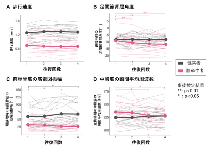 本研究成果は,予測困難な摂動が生じる不整地を歩く際の距離に応じた変化について,脳卒中者と健常者の違いを明らかにしており,リハビリテーション専門家が脳卒中者の屋外歩行の適応や疲労を考える際に着目すべき点を示しています.今後は,より長い距離での歩行パラメータの変化や非麻痺側を含めた戦略の特徴を調査する必要があります.