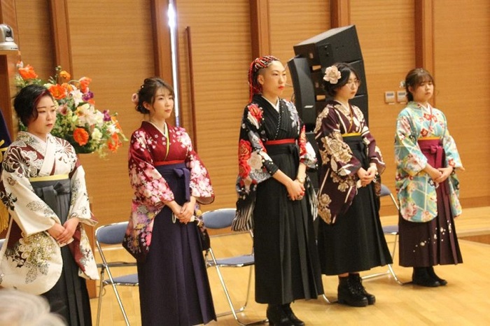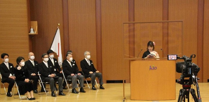 その後、卒業生を代表して教育学部現代教育学科の長あかりさんが謝辞を述べました。最後に学歌をそれぞれが清聴し、厳かな雰囲気でおこなわれた式典は、幕を閉じました。