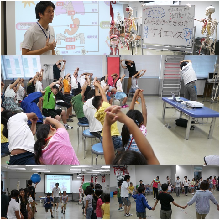 5限目の授業は、理学療法学科松本大輔助教による「胃腸の機能を整える健康体操」です。この授業には理学療法学科の学生8名が子どもたちのサポートをしてくれました。健康でいるためには、胃腸の機能を整えること、それには規則正しい生活、バランスのとれた食事と定期的で適度な運動が必要です。激しい運動をする場合は食後1時間くらいは休憩をとったあとにする、など基本的なことを学びました。また、腹筋運動(複式呼吸、身体のひねり運動)などを毎日続けることが肝心です。