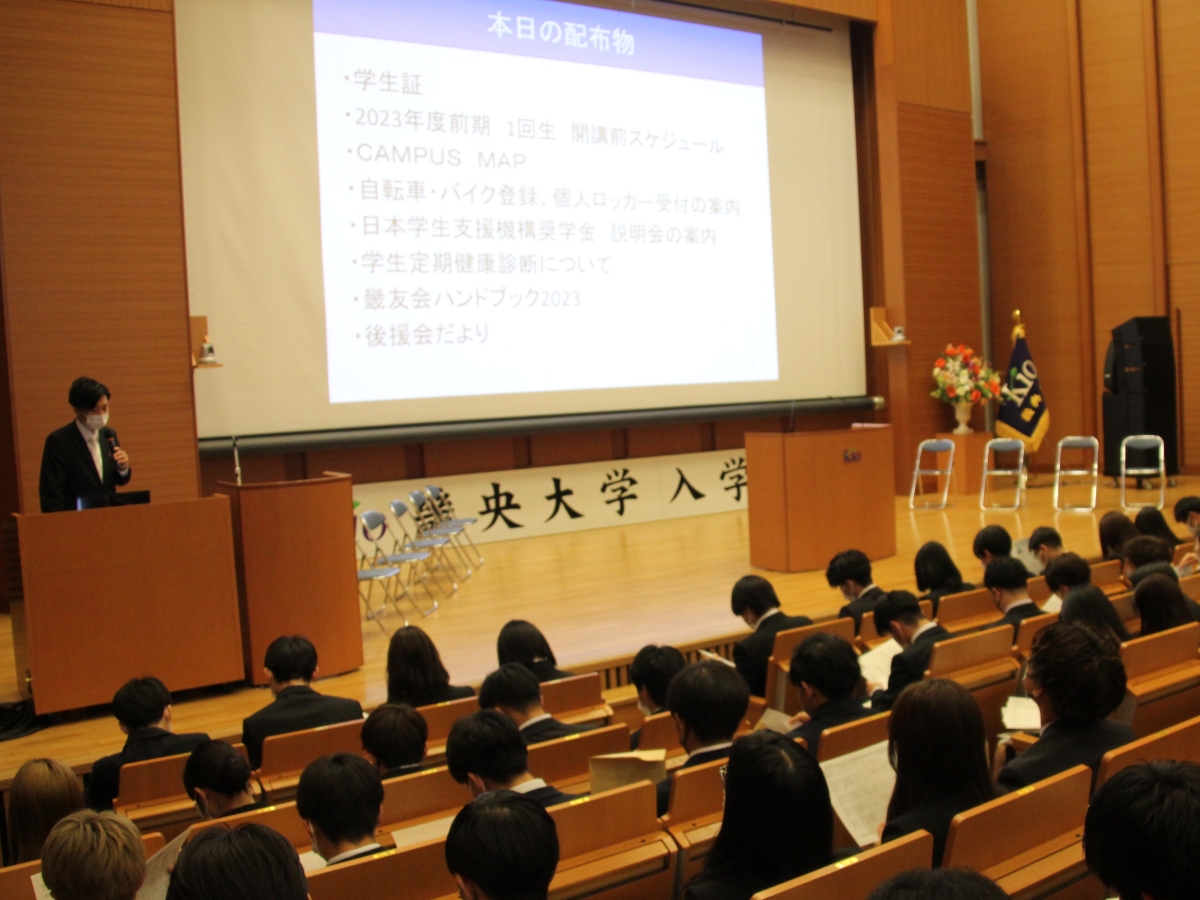 午前の学部生入学式では、全学生が冬木記念ホールに入っての開催は4年ぶり(2019年3月以来)となり、保護者はその様子を各学科の中継会場から視聴・参加する形で行われました。