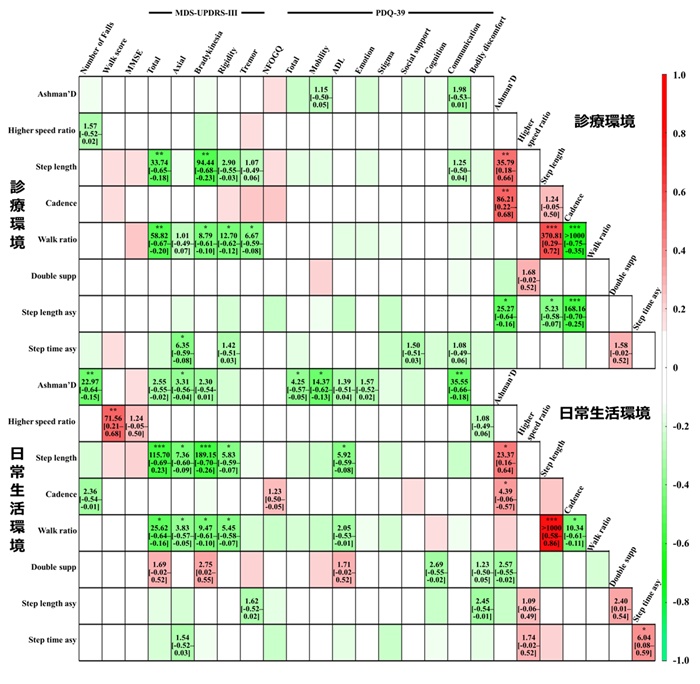 図1.診療環境と自由生活環境における歩行パラメーターの相関係数を示すヒートマップ