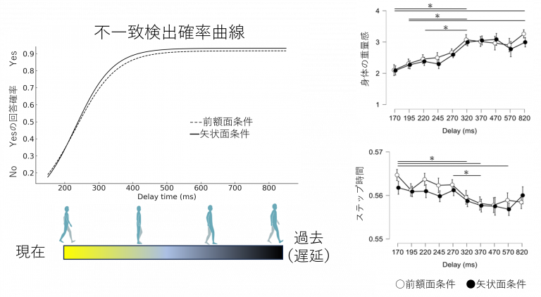 左:不一致(遅延)検出確率曲線を表す。遅延時間の増加に伴い、遅延判断(Yes)の回答確率が上昇していることがわかる。右上:遅延時間増加に伴う身体重量感の変化を表す(7段階評価)。右下:遅延時間増加に伴うステップ時間の変化を表す。 *p<0.05