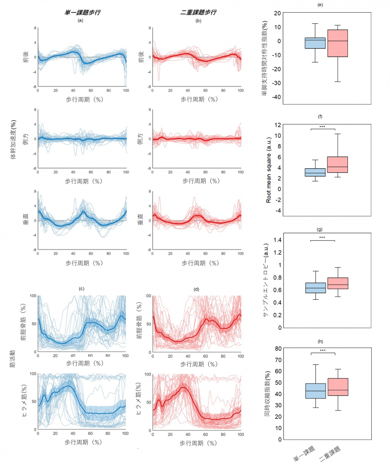 左および中央パネル:単一課題歩行時(a)および二重課題歩行時(b)における体幹の前後方向、側方方向、垂直方向の加速度;単一課題歩行時(c)および二重課題歩行時(d)における前脛骨筋およびヒラメ筋の筋活動。右パネル:条件間における単脚支持時間対称性指数(e);RMS(f);サンプルエントロピー(g);同時収縮指数(h)の箱ひげ図。