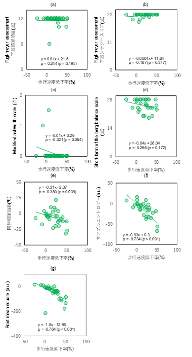 図2.歩行速度低下率と臨床評価および歩行評価との関連性