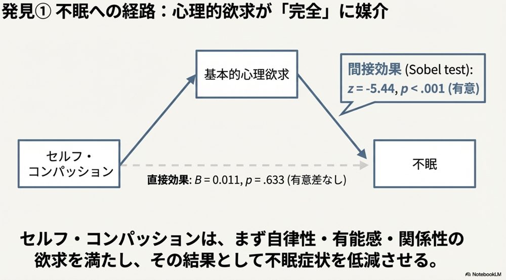 - 特に不眠の改善については、セルフ・コンパッションが心の欲求を満たすことを通じて、ほぼ全て説明できる(完全媒介)という強力な結果が得られました。