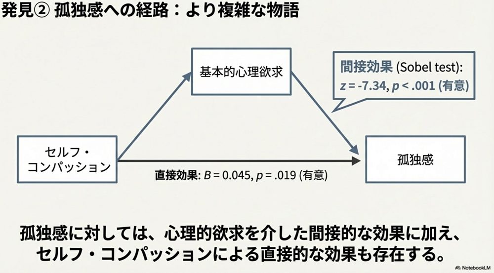 セルフ・コンパッションは、基本的な心理的欲求を満たすという間接的な経路に加えて、孤独感そのものに対して直接的にもプラスの影響を与えていることが確認されました。 これは、セルフ・コンパッションが、心の欲求を満たすだけでなく、自分を過度に批判する気持ちを減らしたり、他人に対して心を開きやすくなったりといった別の心理的メカニズムを通じて、直接的に孤独感を和らげている可能性を示唆しています。