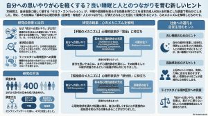 - 「自分への優しさ(セルフ・コンパッション)」が高い人ほど、眠りの悩み(不眠症状)や孤立感(孤独感)が低いことが確認されました。