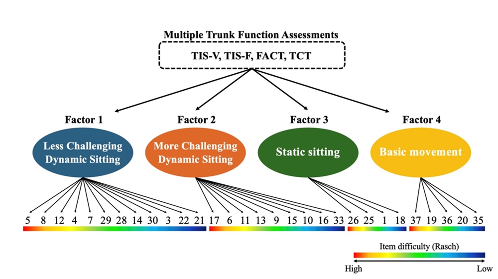 - 探索的因子分析とRasch分析を用いた結果、体幹機能は「静的座位」「基本動作」「動的座位(より挑戦的な課題)」「動的座位(挑戦的ではない課題)」の4つの因子に分類され、それぞれの難易度が段階的に高くなる階層構造を持つことが明らかになりました。